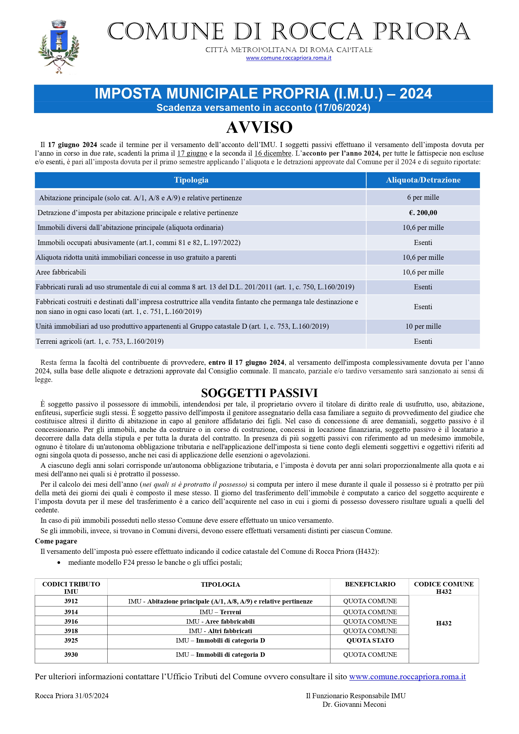 Il versamento dell’imposta può essere effettuato indicando il codice catastale del Comune di Rocca Priora (H432) mediante modello F24 presso le banche o gli uffici postali.